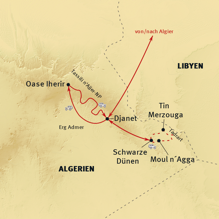 Algier - Djanet - Tassili N'Ajjer - Erg Admer - Iherir - Idaran - Essendilene - Timzguida - Moul n'Aga - Tadrart - Egedi - Tehak - Djanet - Algier